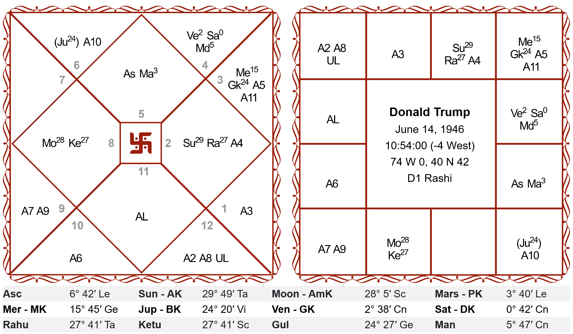 On 20 January 2017, he took oath as the President of the US. He was running Mars dasha and Darmiyani dasha of Mars.